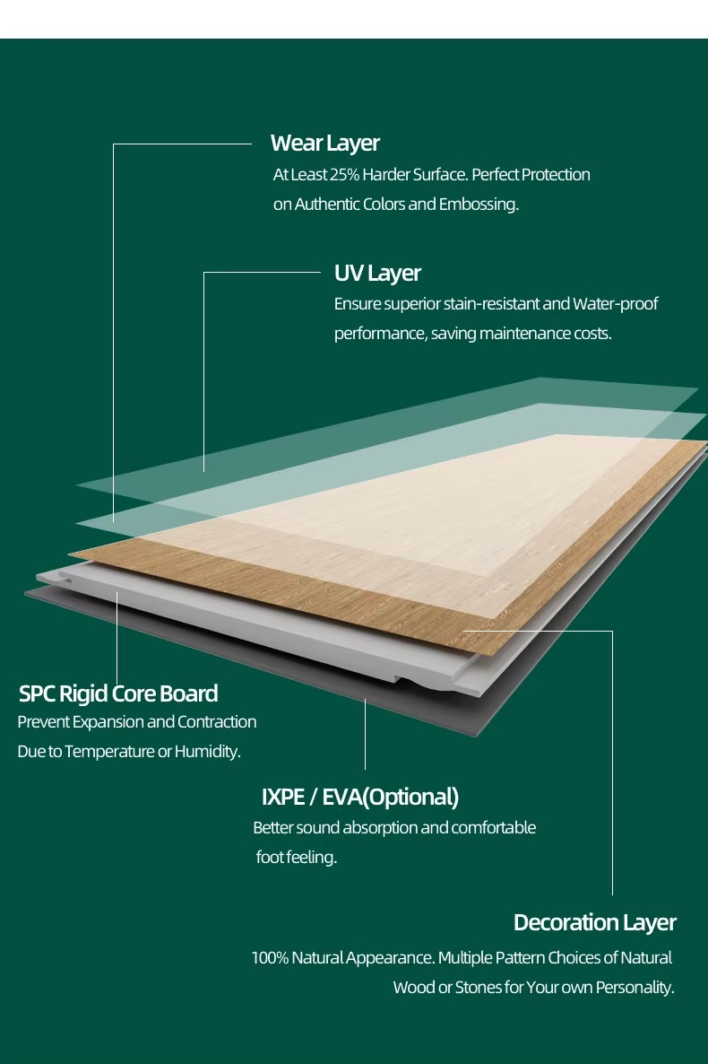 La capa resistente al desgaste de la superficie del piso SPC es una capa resistente al desgaste transparente de procesamiento de alta tecnología, su rotación resistente al desgaste puede alcanzar aproximadamente 10000 rpm.